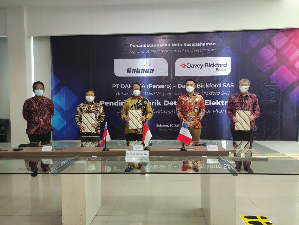 Jakarta, TAMBANG – PT DAHANA (Persero), BUMN yang bergerak di bidang bahan peledak pertahanan dan komersial akan mendirikan Pabrik Detonator Elektronik pertama di Indonesia. Hal tersebut ditandai dengan penandatanganan nota kesepahaman antara PT DAHANA (Persero) dengan mitranya dari Perancis Davey Bickford SAS di Kampus Dahana Subang pada Jumat, 30 Juli 2021.
